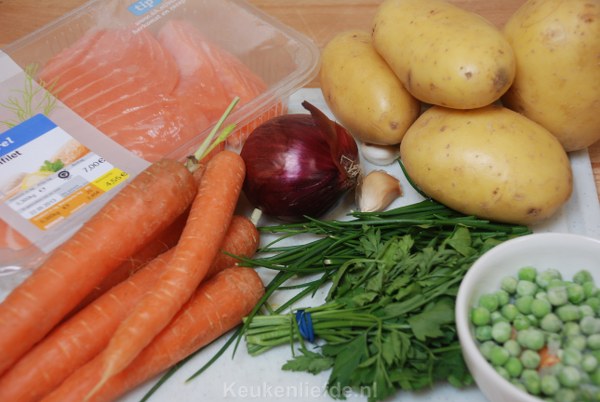 Dep de zalm droog en bestrooi beide kanten met zout en peper. Snijd de zalm in blokjes en voeg deze pas toe als de aardappels, wortels en ui gaar zijn. Roer de zalmblokjes en kruiden er heel voorzichtig doorheen en zet dan het vuur uit.