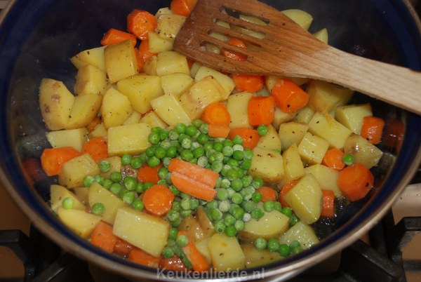 Verhit een hapjespan of braadpan met wat olie en bak de aardappels en wortels rondom even aan. Voeg dan een scheut water en zout en peper toe en laat met de deksel op de pan, rustig gaar stoven.