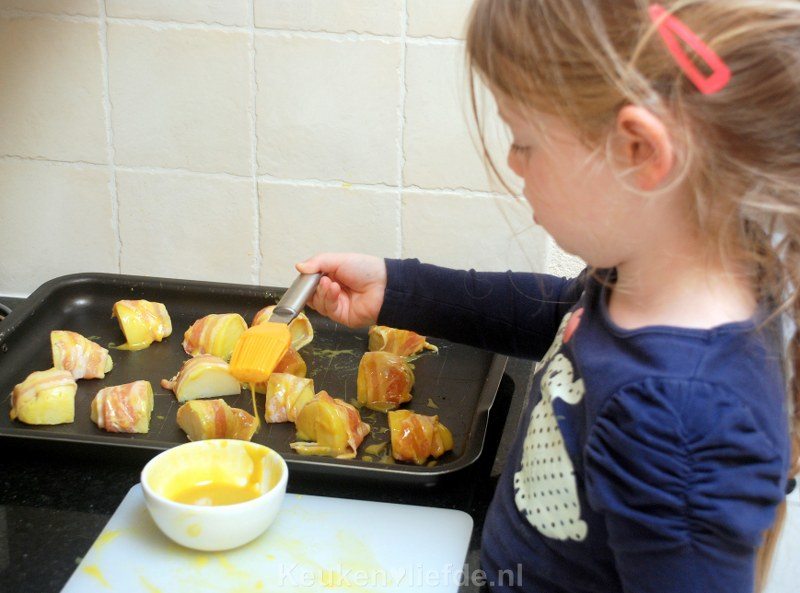 Rol om iedere aardappel een half plakje spek en leg de aardappels op een met olie bestreken bakblik. Bestrijk de aardappels en spek tot slot nog een keer aan de buitenkant met het honing-mosterdmengsel.