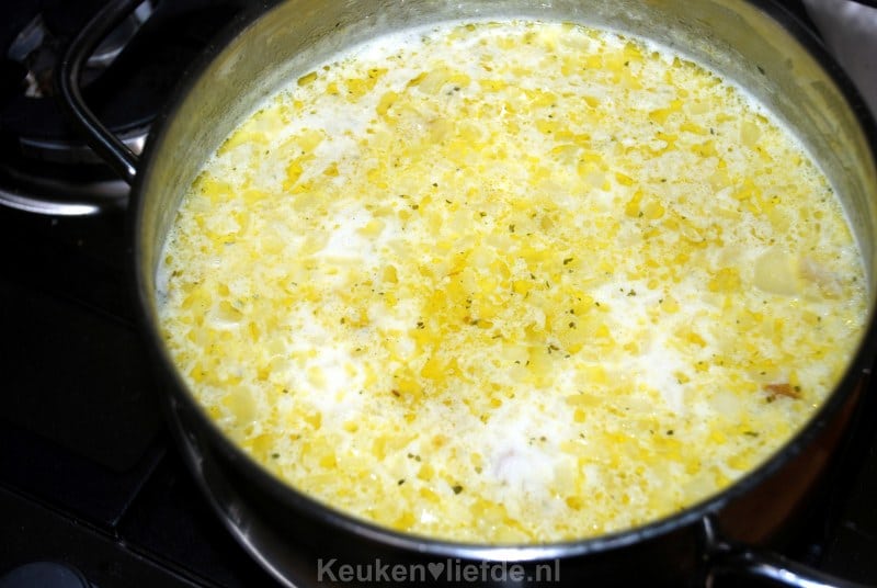 Bak op laag vuur circa 10 minuten zachtjes verder. Voeg de kippenbouillon en melk toe, breng aan de kook en laat 10 minuten zachtjes pruttelen.