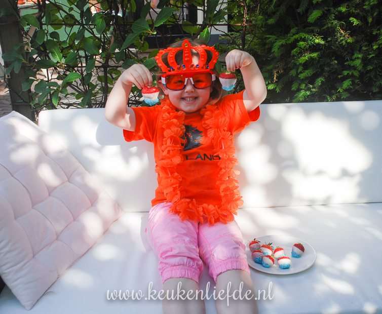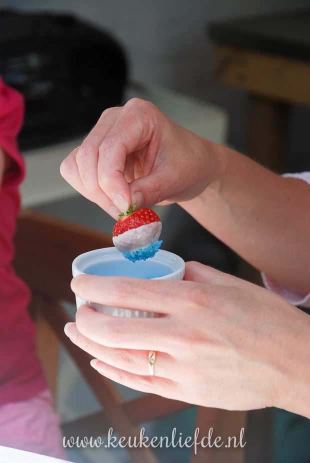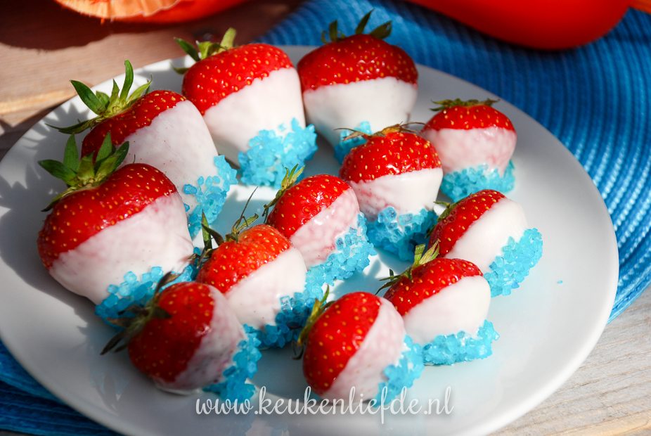 Een feestelijk hapje om op tafel te zetten tijdens Koningsdag, of om van te genieten tijdens een spannende voetbalwedstrijd: aardbeien in witte chocoladedip en blauwe suiker. Hup Holland Hup!