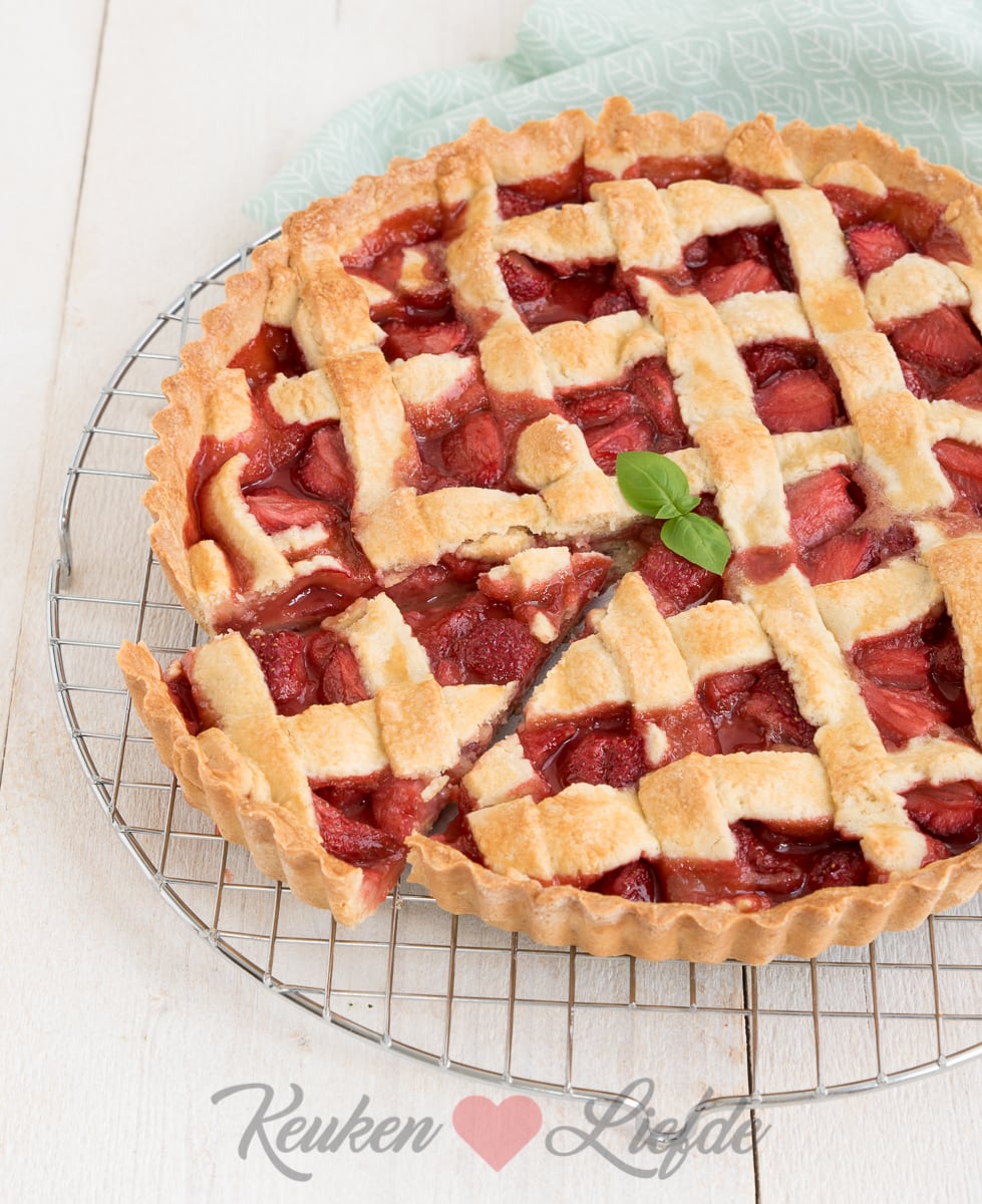 Bestuif een werkblad met wat bloem. Rol 2/3 van het deeg uit tot een ronde lap en bekleed de taartvorm hiermee. Verdeel de aardbeienvulling over de bodem. Rol het overige deeg uit en snijd in lange, smalle repen. Bedek de taart met de repen deeg. Bestrijk het deeg met losgeklopt ei. Bak de taart in het midden van oven circa 30 minuten, of totdat het deeg goudbruin is.