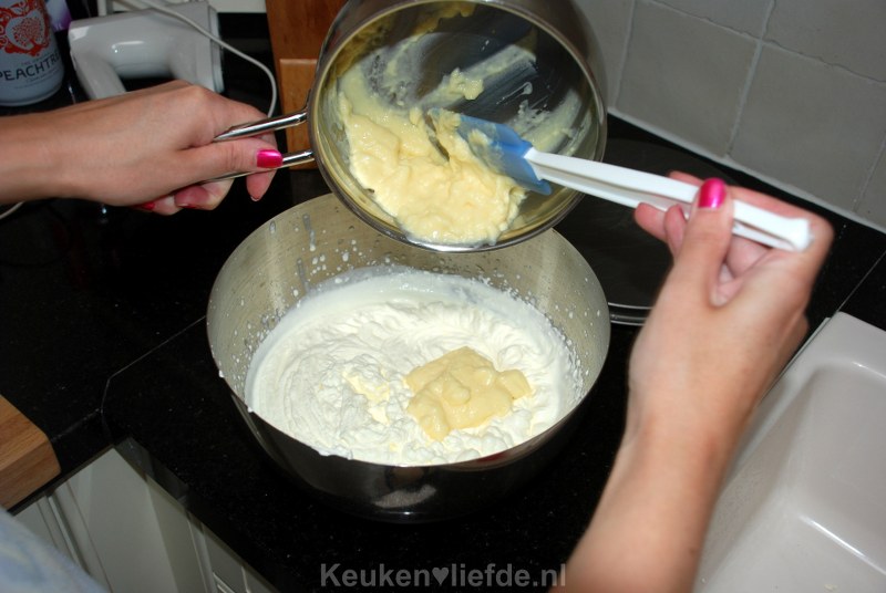 Gefeliciteerd met je dochter! Wat vervelend dat het zo klontert. De volgende keer zou ik de custard eerst goed losroeren, alvorens je het door de slagroom roert. Hoewel het bij mij niet klonterde, heb ik het toch aangepast in bovenstaand recept.