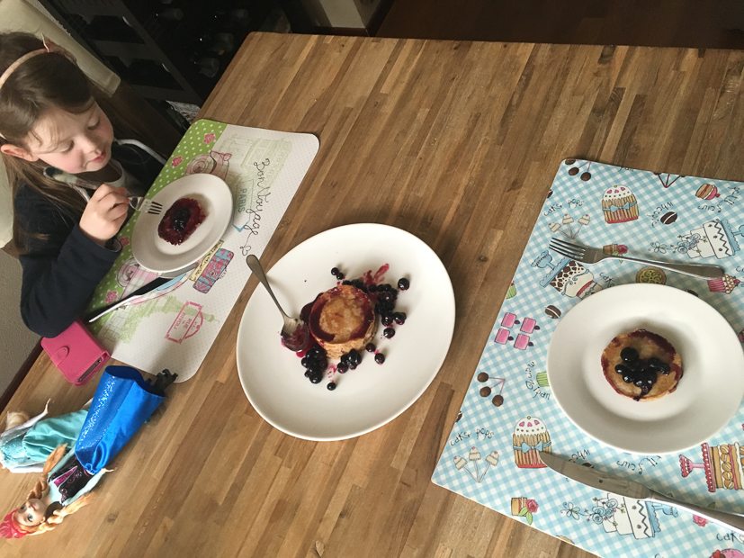 Ik maak havermout-pannenkoekjes (recept volgt) als ontbijt die ik serveer met blauwe bessen die ik even kort heb verwarmd met wat suiker, totdat het sap vrijkomt. Wat een heerlijk begin van de dag!