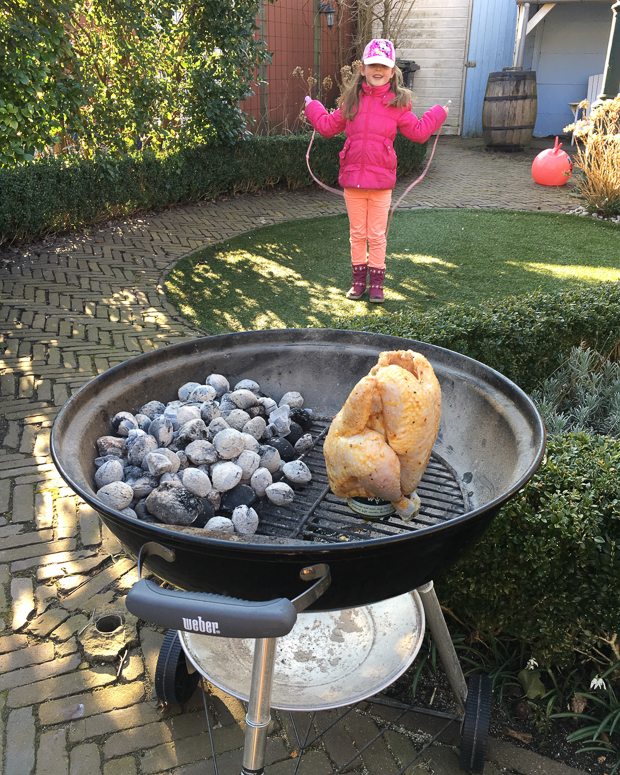 De rest van de dag blijven we thuis. Johan steekt ’s middags de vuurkorf aan en later ook de Weber. Op het menu vanavond staat kip op bierblik van de barbecue.