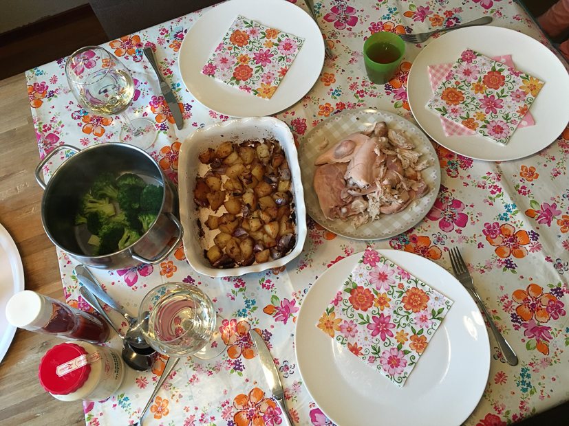 ’s Avonds eten we geroosterde aardappels uit de oven, gekookte broccoli, zelfgemaakte kaassaus en gebakken kipschnitzels. Simpel en heel erg lekker!