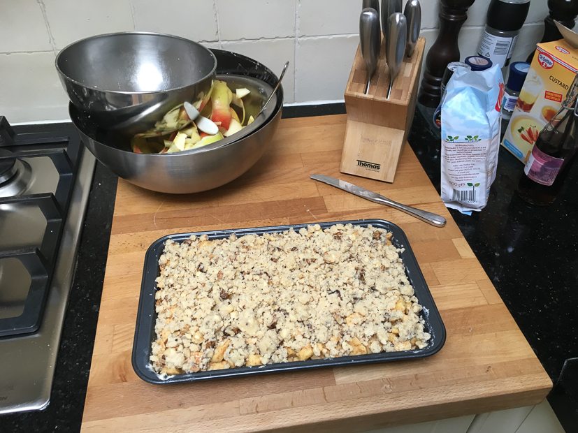 Johan zijn vader komt helpen met wat klusjes rondom huis. Ik maak ondertussen Italiaanse tortellinisoep voor de lunch en deze appelkruimeltaart van het bakblik. Van Johan en Ella-Marie mag ik geen andere appeltaart bakken dan deze.