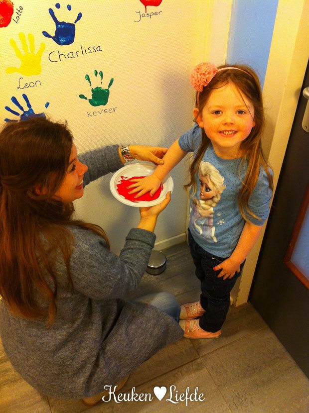 Ella-Marie heeft haar laatste logopedie-les en mag haar handje op de muur zetten. Zo trots als een pauw!
