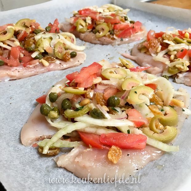 Na al het overdadige eten (lees: veel chocoladepaaseitjes) tijdens de paasdagen heb ik zin in gezond en licht avondeten. We eten chicken paillard (gevlinderde kip) met venkeltopping: opengesneden kipfilet, belegd met een mengsel van venkel, tomaat, olijf, kappertjes, sjalot, geroosterde pijnboompitjes en rozijntjes. Daarna gaat het kort de oven in. Het is één van de allereerste recepten die ik deelde op KeukenLiefde en nog steeds mijn favoriet. Zo ontzettend smaakvol. Hier mag je me ’s nachts voor wakker maken!