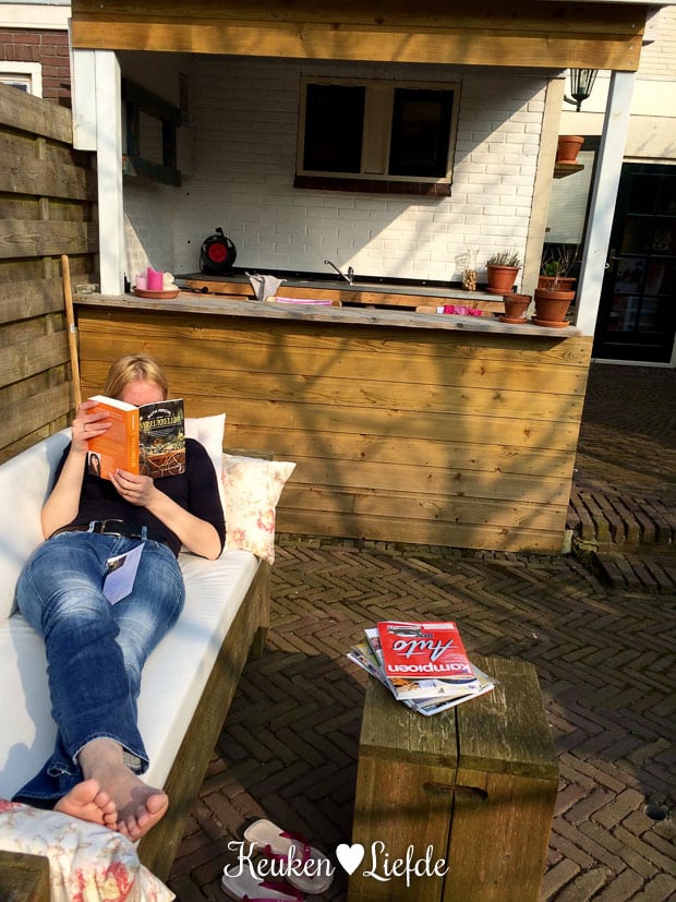 Het is zulk waanzinnig lekker weer dat ik om twee uur ’s middags besluit de laptop aan de kant te gooien en naar buiten te gaan. Het grote voordeel van thuiswerken! Ik rommel lekker in de tuin en leg voor het eerst dit jaar de kussens weer op de loungebank.