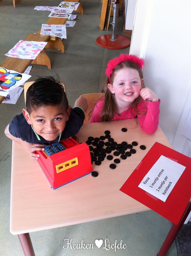 Om half twaalf ga ik naar school om een kunstvoorstelling te bekijken van de klas van Ella-Marie. De gymzaal is omgetoverd tot een expositie van kunstwerken die we kunnen kopen met dropmunten. Ella-Marie zit zo trots als een pauw achter de kassa.