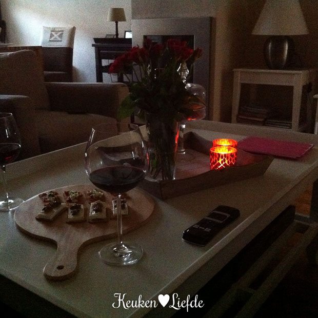 Als El ’s avonds op bed ligt, kijken Johan en ik een filmpje met een glas wijn en hapjes erbij.