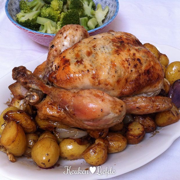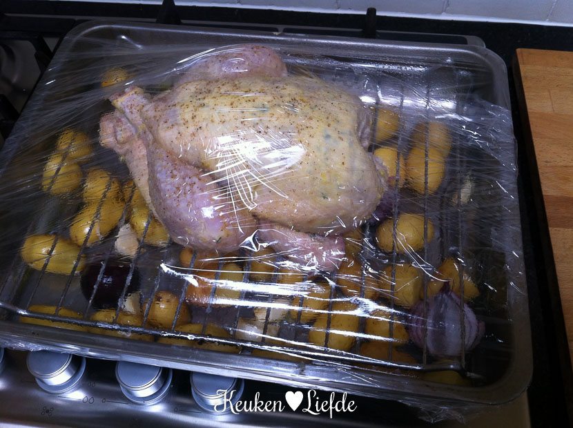 Ik maak ’s ochtends het avondeten al klaar: een braadslee vol met krielaardappels in de schil en een hele kip met tijm-, citroen- en knoflookboter. Zowel Johan, Ella-Marie als ik zijn er dol op!