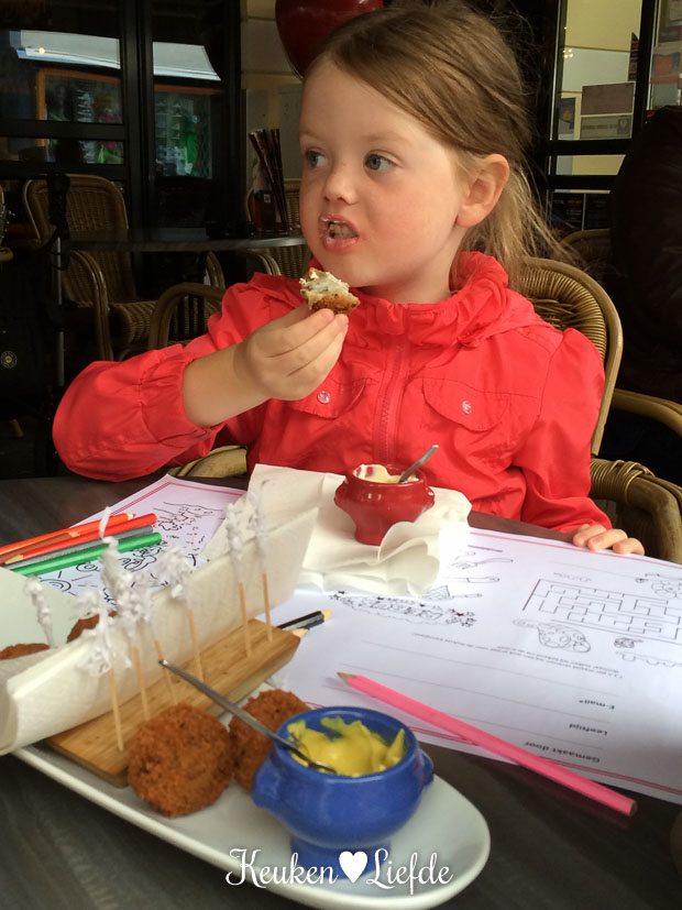 ’s Middags gaan we fietsen. Ella-Marie fietst voor het eerst op haar eigen fietst naar de stad en dat verdient een drankje. En vooruit, een bitterbal.