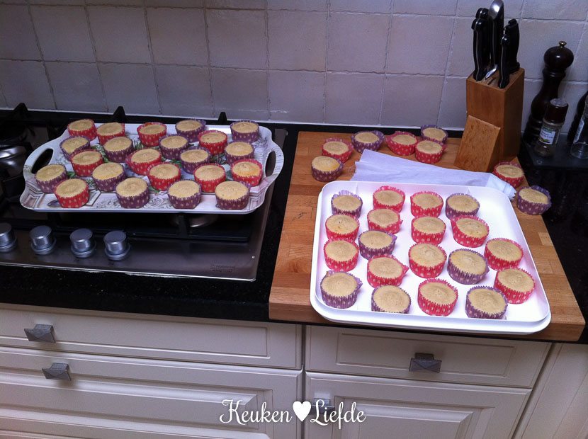 Als Ella-Marie weer thuis is van school, ga ik direct aan de slag. Ik heb circa veertig traktaties nodig, maar bak voor de zekerheid vijftig cupcakes. Als de cakejes gebakken zijn, maak ik de botercrème. Die bewaar ik afgedekt in de kelder en spuit ik morgenvroeg — vlak voor het uitdelen — op de cakejes.