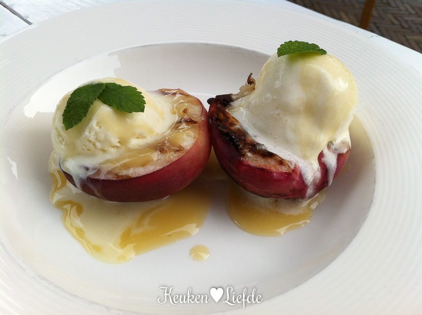 Na de cheeseburger maken we ook nog een toetje op de barbecue: gegrilde perzik met roomijs en karamelsaus.