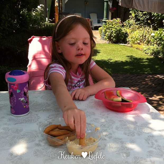 Twaalf uur. Ik haal Ella-Marie uit school. Ze heeft de komende zes weken vakantie! We lunchen met watermeloen en hoemoes dipper van Maza uit de goodiebag van Semilo. Lekker!