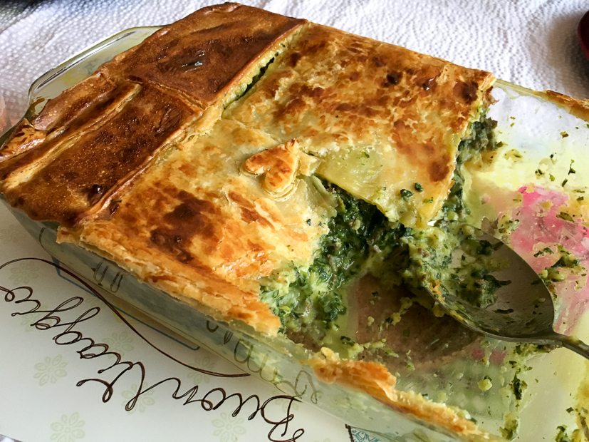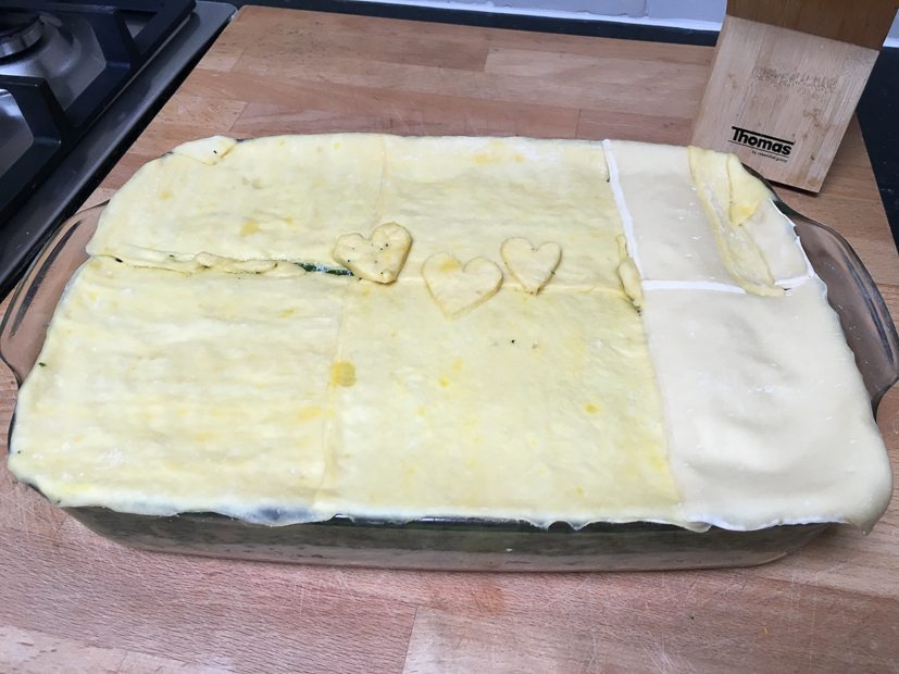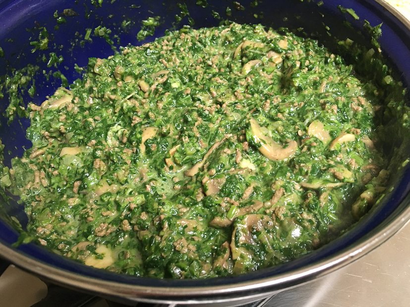Weer thuis maak ik een spinazie-ovenschotel met gehakt en bladerdeeg. Ik voeg dit keer ook nog wat champignons toe.