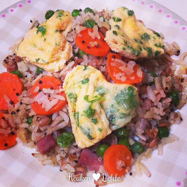 Ik heb nog een restje gebakken rijst over van gisteren en samen met een paar gebakken eieren genieten we zo van een heerlijke kliekjesmaaltijd. Love it!