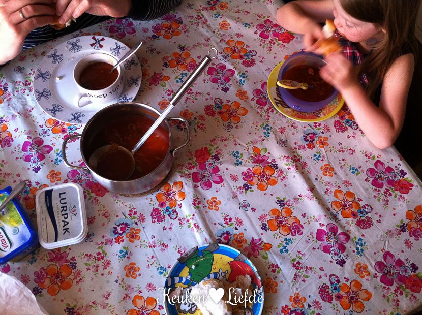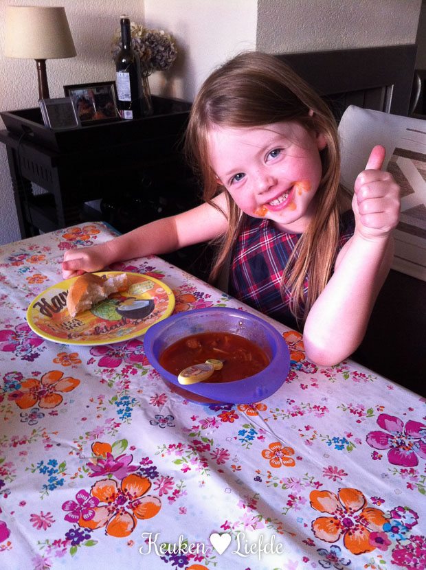 ’s Avonds eten we tomatensoep met bolletjes. Dé favoriet van Johan en Ella-Marie.