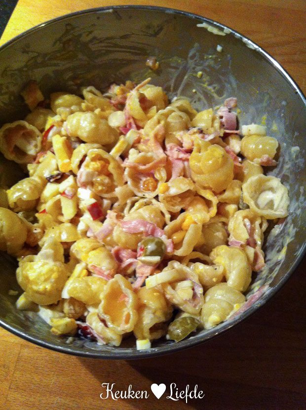 Na het avondeten heeft Johan nog energie over en besluit een pastasalade te maken om morgen mee naar zijn werk te nemen. Johan is Koning van de pastasalades. Echt. In deze variant zit appel, sjalot, ham, zilverui, augurk, olijf, ei, notenmelange, cranberry, honing, mosterd en mayo. Kortom, Johan flikkert er alles in wat hij tegenkomt in de koel- en kelderkast en dat werkt. Verslavend lekker!