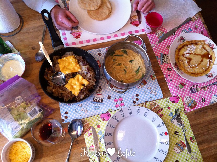 Kliekjesdag! Op het menu: shoarma, pasta in spinazie-kaassaus en pannenkoeken. Wat een feest op de maandag.