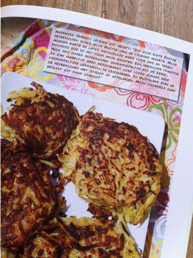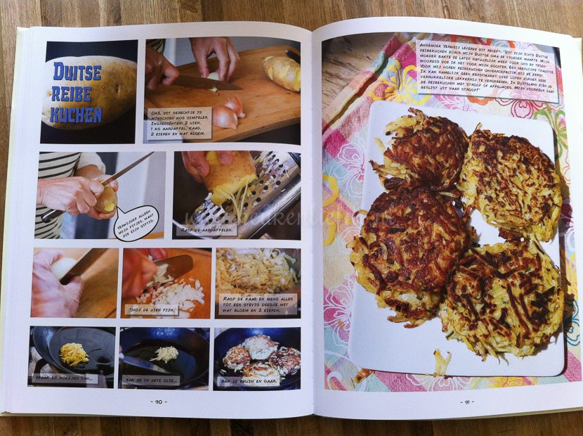 De postbode bezorgt dit leuke kookboek: het World Granny’s Kookboek. Helemaal leuk is dat er een recept van mij — of eigenlijk moet ik zeggen van mijn oma — in staat: Duitse reibekuchen. Wel jammer dat de kok het recept iets heeft aangepast en kaas toevoegt. In het oorspronkelijke recept van mijn oma zit geen kaas en naar mijn mening hoort dit er ook niet in. Verder is het een leuk boek, met heerlijke recepten!