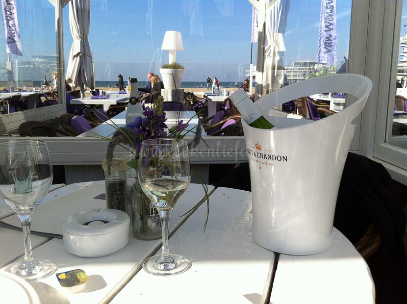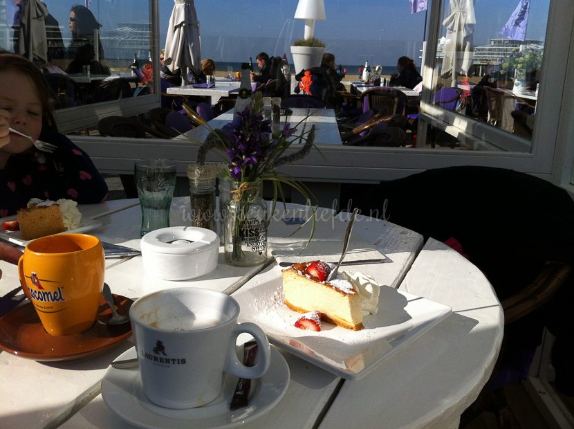 Halverwege de middag strijken we neer in één van de vele strandtentjes die de boulevard van Scheveningen rijk is. We eten appeltaart en New York cheesecake met slagroom en een uitsmijter. Je kunt vast wel raden wie wat heeft … 🙂 We sluiten af met een lekker wijntje.