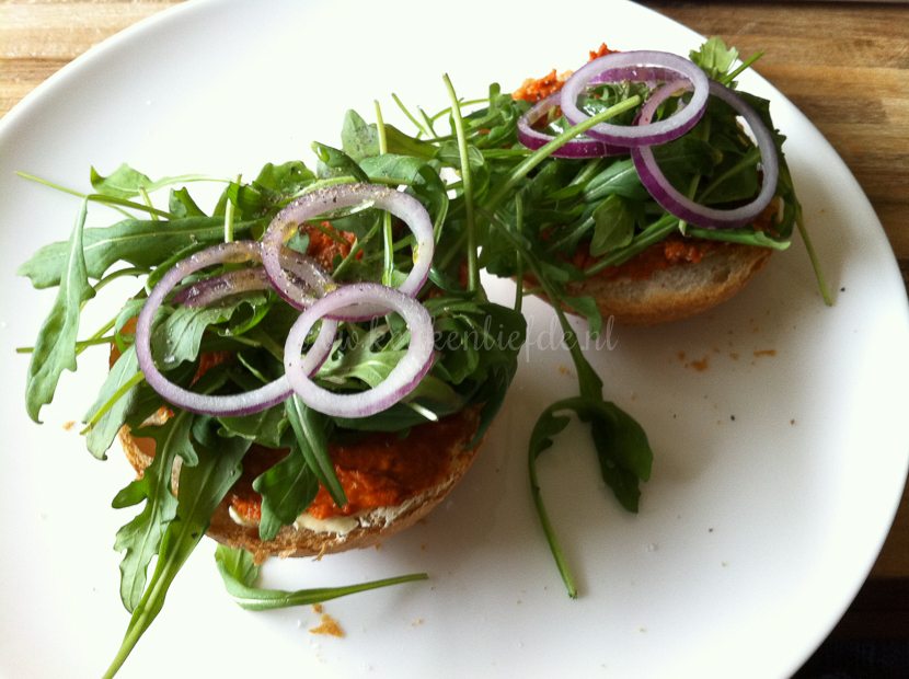 Ik lunch met een lekkere bol van de bakker belegd met filet american, rucola en rode ui.