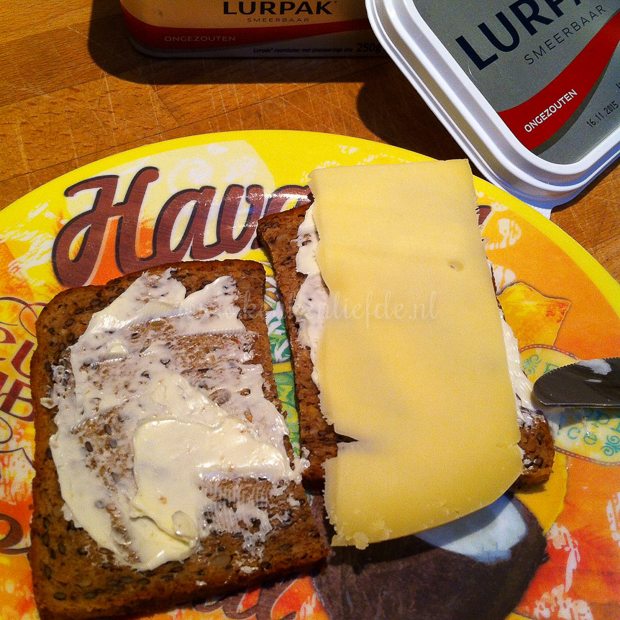 Ik besmeer direct een lekkere bol met de ongezouten Lurpak en beleg de ene helft met vlokken en de andere met kaas. Jammie!