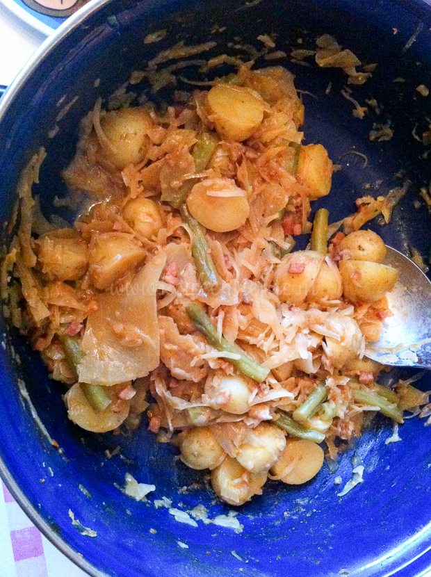 Ik heb nog wat krieltjes en sperziebonen liggen en besluit voor het avondeten weer een Hollands satépannetje te maken. Ik voeg extra een flinke zak gesneden witte kool uit de diepvries toe — dat ruimt weer lekker op — en ik serveer er zachtgekookte eieren bij in plaats van een gebakken ei. Volgens Johan is deze variant nóg lekkerder dan de vorige …