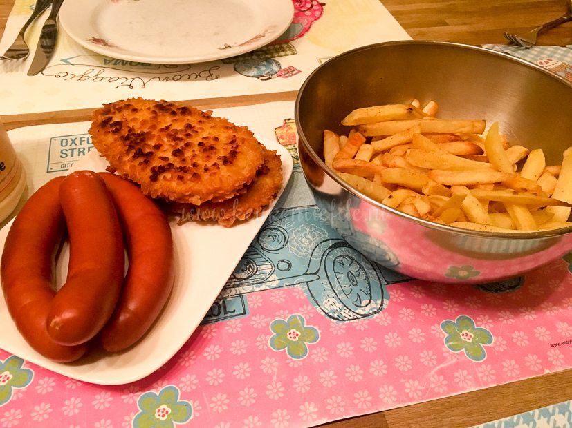 Heb je ooit zo’n hoopje ellende gezien? Ik niet! Dit is duidelijk niet mijn dag. Uiteindelijk eten we frietjes met kipschnitzel en bockworst. Zucht.