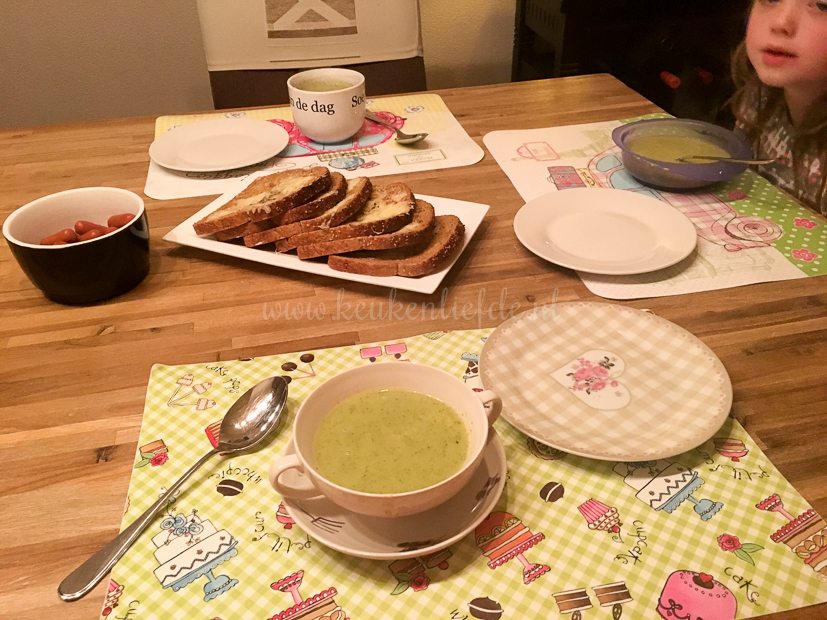Het favoriete eten van Ella-Marie staat weer op tafel: broccolisoep. Johan kookt vanavond (ik ben geveld door buikgriep) en serveert er ook wat broodjes met kaas uit de oven bij.