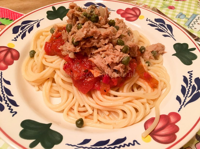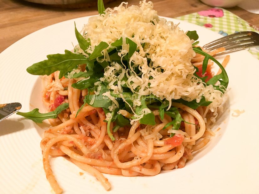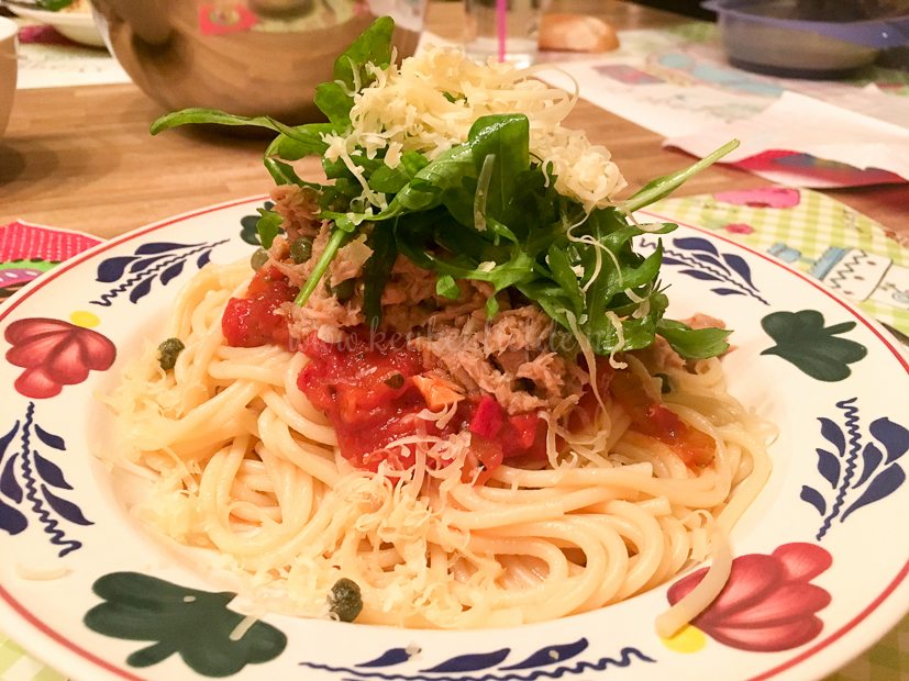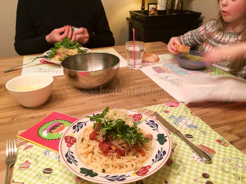 Johan mag weer de keuken in. Hij maakt spaghetti met tomatensaus en tonijnsaus. Erbij wat rucola en geraspte kaas.