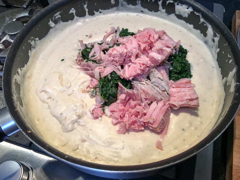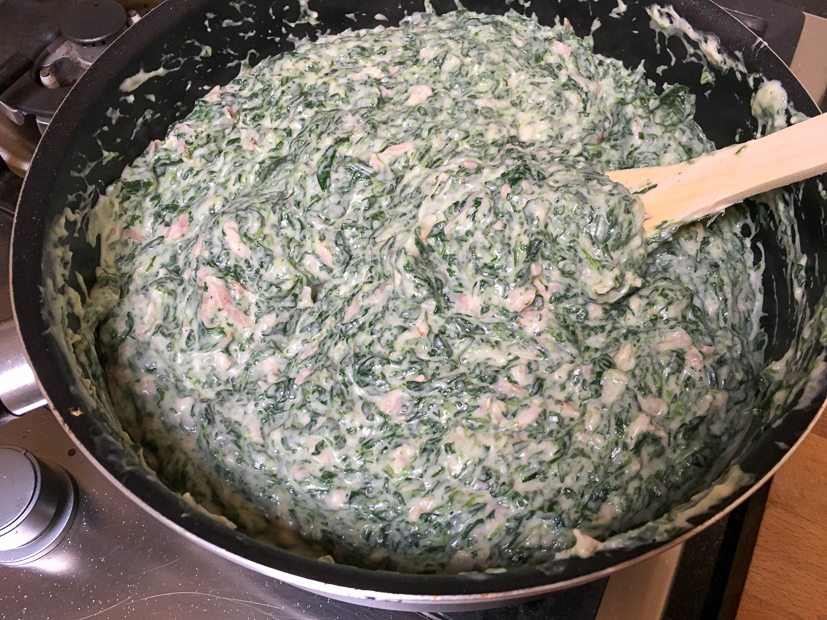 Ik bak een grote stapel want voor het avondeten vul ik ze met zelfgemaakte spinazie à la crème (gemaakt van verse spinazie) en ham. Na het vullen gaan ze in een ovenschaal en bestrooi ik ze met roquefort. Even gratineren in de oven en smullen maar. Eten voor de goden! Het recept vind je hier.