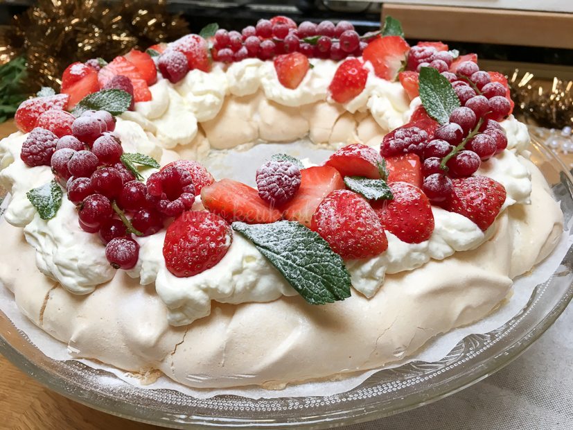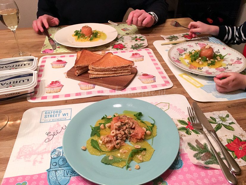 De zalmbonbons eten we ’s avonds als avondeten met wat geroosterd brood erbij. De pavlova kerstkrans is ons toetje. Tja, voor een foodblogger is het de hele maand december kerst.