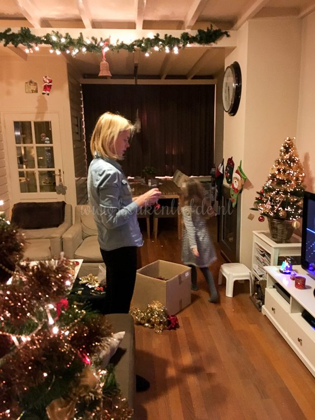 Na het eten brengen we het huis in kerstsfeer. Omdat we dit jaar geen ruimte hebben voor een grote kerstboom, zetten we drie kleine kerstboompjes. Ook gezellig toch?