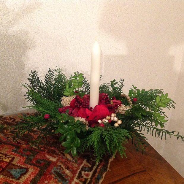 Johan zijn ouders brengen Ella-Marie ’s middags weer thuis. Daarna gaan we nog even op bezoek bij mijn ouders. Ik had mijn moeder gevraagd een kerststukje te maken om bij ons op tafel te zetten. Ik kan er natuurlijk ook gewoon ééntje kopen, maar die kunnen niet tippen aan die van mams. Deze mag ik mee naar huis nemen. Mooi he.