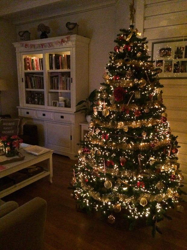 Na het eten hang ik de laatste ballen in de kerstboom. Ik hou van een boom met veel ballen. 🙂 Blij dat -ie weer staat, geeft zoveel sfeer in huis!