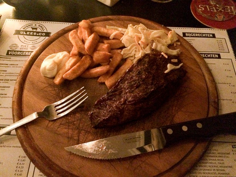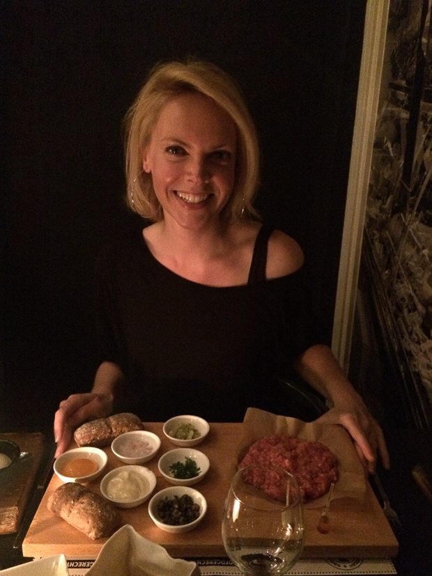 Na al het kookgeweld van afgelopen week is het tijd voor wat ontspanning. Ella-Marie gaat logeren bij de ouders van Johan en Johan en ik gaan met vrienden een avondje op stap. We eten een hapje bij Vlees & Co in Arnhem. Dikke aanrader! Ik ben dol op steak tartare en vroeg aan de vriendelijke jongeman van de bediening of ik deze ook als hoofdgerecht kon bestellen. Na kort overleg met de chef-kok vertelt hij dat dit inderdaad mogelijk is. Of ik wel weet dat dit rauw vlees is. Haha!