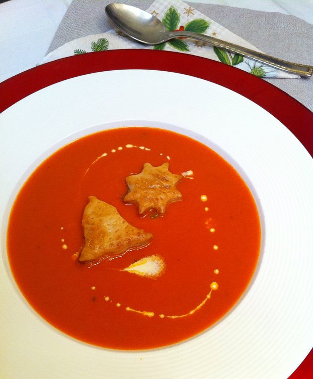 En nu we toch bezig zijn, maak ik er direct maar een tomaten-crèmesoep achteraan. Een simpel maar lekker voorgerecht om tijdens kerst te serveren, maar eigenlijk smaakt -ie prima op elke dag van het jaar en elk moment van de dag.