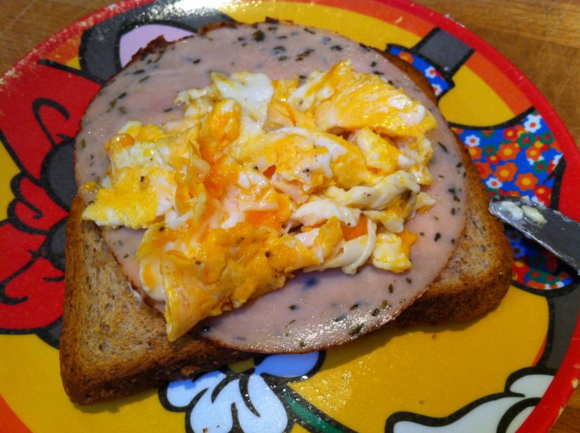 Ook ontbeten trouwens. Dat doe ik met geroosterd bruinbrood, kipfilet en roerei. Jum!