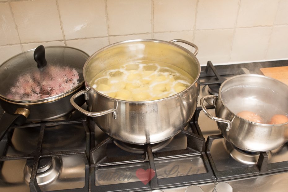 Schil de aardappels en kook ze totdat ze gaar zijn. Kook in een andere pan de eieren hard.