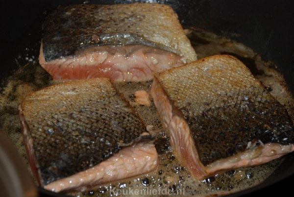 Zalm moet altijd nog glanzend van binnen zijn en net niet helemaal gaar. Wanneer je zalm te lang bakt wordt hij droog en beslist niet lekker, echt zonde! Blijf er dus altijd bij tijdens het bakken. Schep alles op borden en garneer met een beetje vers gehakte peterselie.