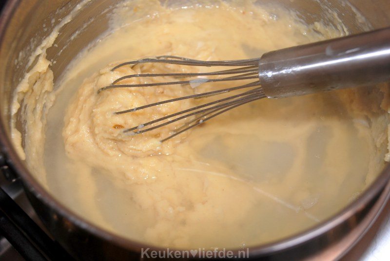 Smelt de boter in een ruime pan en voeg de bloem toe. Laat de bloem op laag vuur, al roerend, zachtjes meegaren.