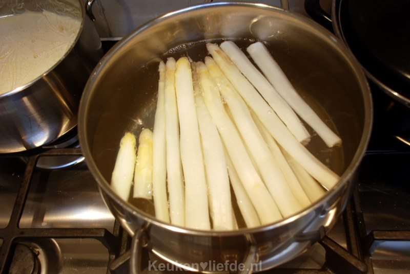 Vul een grote pan met heet water en breng met de deksel op de pan aan de kook. Voeg de asperges toe aan het kokende water, zet het vuur iets zachter en kook de asperges 8 minuten, of totdat ze zacht zijn, maar nog wel stevig.