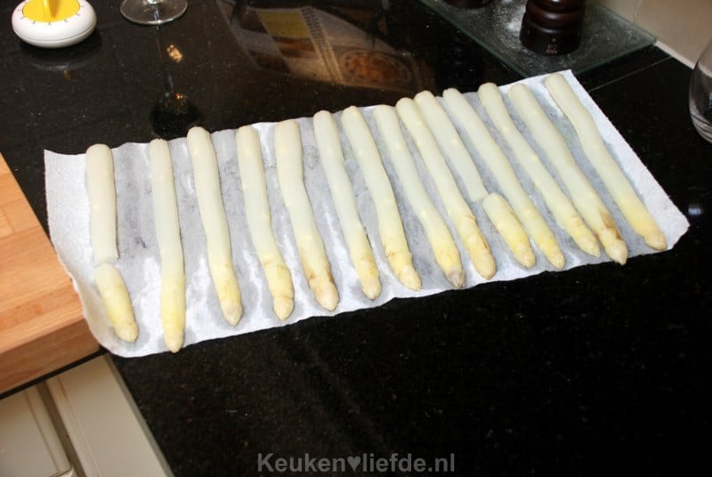 Schep de asperges uit het kookvocht en leg ze op enkele stukken keukenpapier om het vocht kwijt te raken.