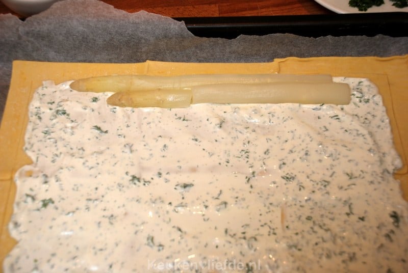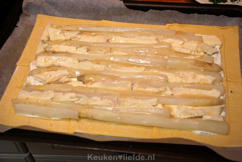 Bestrijk het bladerdeeg binnen de rand met crème fraiche, vermengd met 1 eetlepel peterselie en wat zout en peper. Leg nu om en om twee asperges en repen brie naast elkaar totdat ze op zijn.