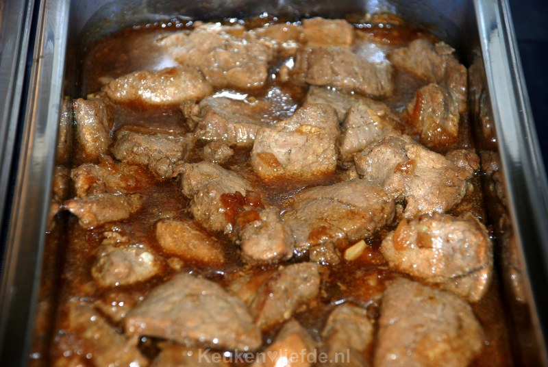 Proef de saus en voeg eventueel wat meer water of ketjap toe. Voeg op het laatste moment het vlees weer toe en warm weer even zachtjes op in de saus.
