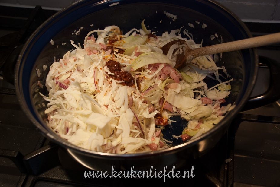 Dit is tevens een ideaal gerecht om restjes groenten mee op te maken. Zo kwam ik in de koelkast een restje witte kool tegen die erbij mocht. Een blijvertje, deze variant.
